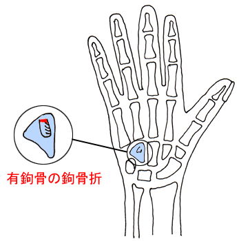 転んで手を付いて骨折することもありますが、ほとんどはゴルフクラブなどを長期間、熱心に振り続けた結果、有鉤骨の鉤の部分に疲労骨折をおこすものです。